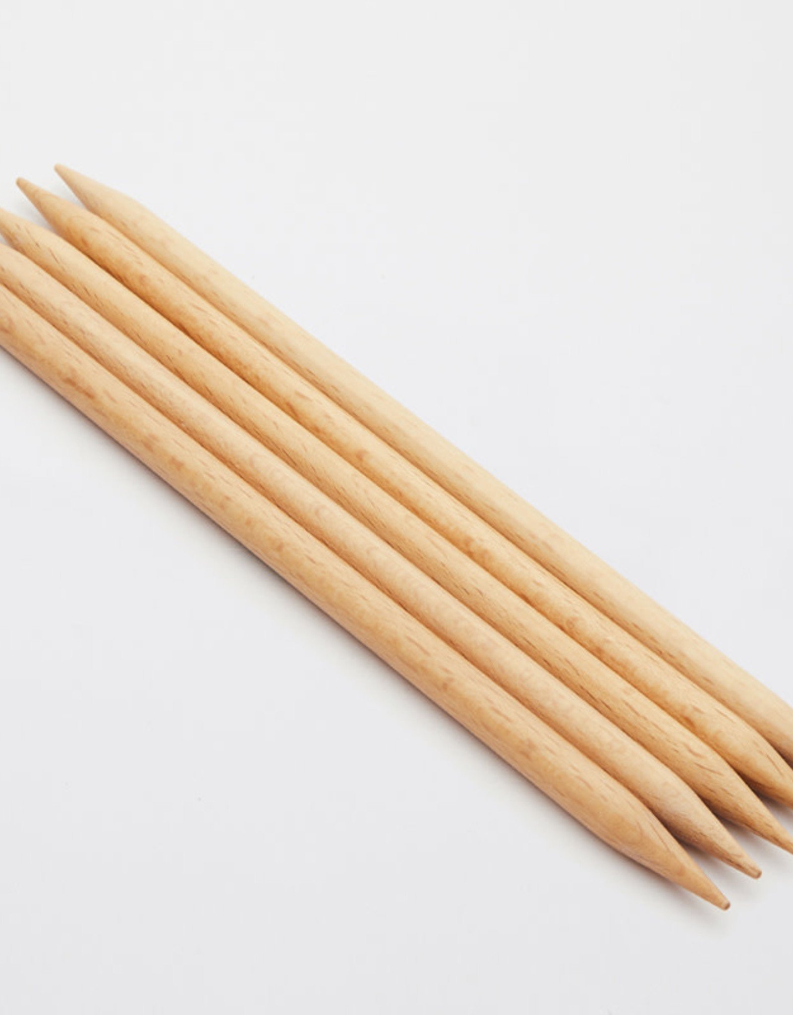 8" double points set. Has the lightness of birch and the strength of natural wood. Needle tips made of birch wood mean perfect points. Ideal for todays chunky yarns easy stitch glide and no snagging. Now available up to Jumbo size 25mm (US 50) Provides hours of pleasurable knitting with no hand fatigue. Warm to the touch, and gentle in the hand.